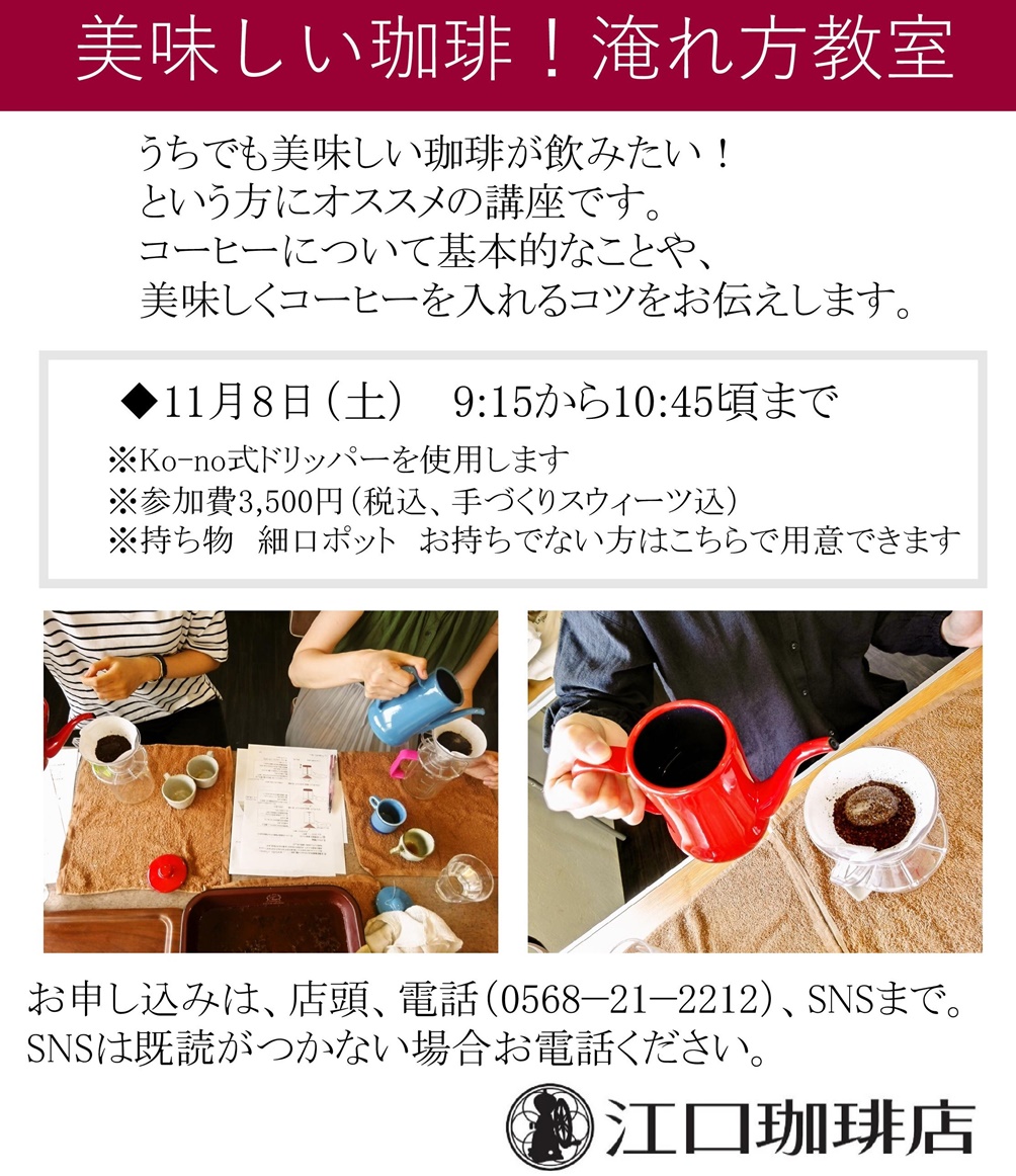今後のコーヒー教室の日程について、決まりましたら随時お知らせしてきます。