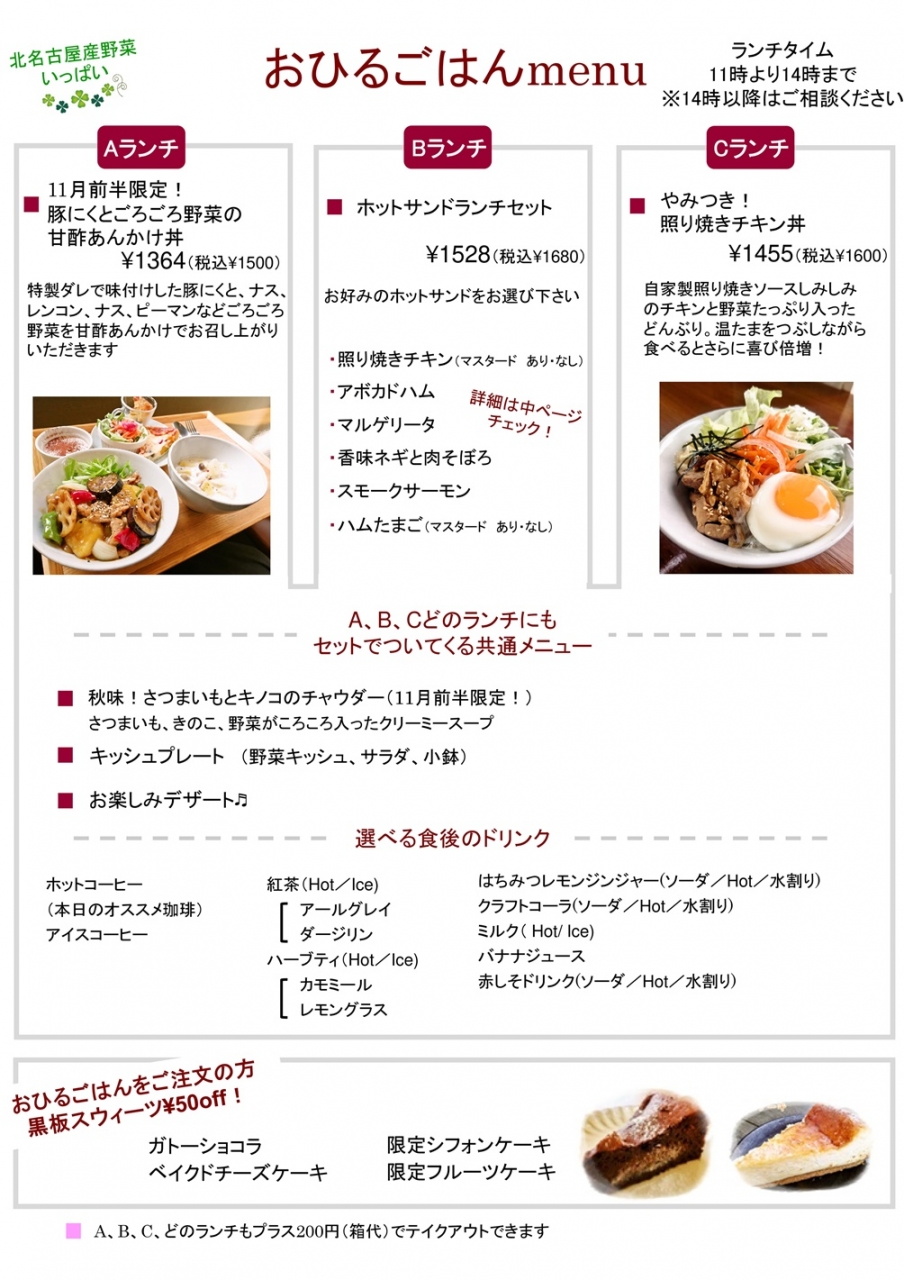 おひるごはんAセットに、黒板スウィーツとおかわりドリンク(合計2杯)で2000円(税抜)!